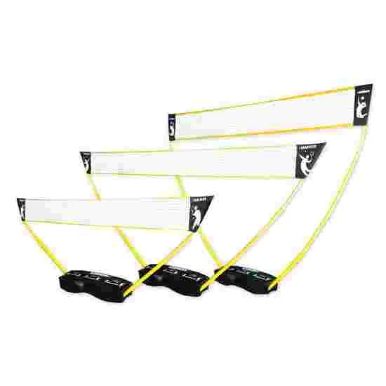 Combines 3 sports in 1 and can be set up and put away again in no time at all. The 3-in-1 set for volleyball, badminton and tennis from Hammer is extremely practical and guarantees fun for all ages. This set is best suited for a quick game on the beach, in the garden or the park. The set can be quickly stored away and easily transported thanks to the handy carry case, which also serve as the net stands. The telescope net posts can be extended to the desired height. The corresponding net is fixed in place and the fun can begin. Ideal net tensioning thanks to the flexible bars. 3 U-shaped ground anchors for attaching to the ground, offering stability in wind and rain. The net heights comply with the standards of the relevant sport. Size of carry case: approx. 85x33x37 cm.