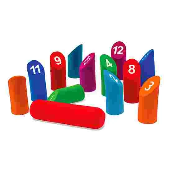 Unlike conventional skittles, the cones made of natural rubber have to be knocked over with a throwing stick. Skittle size: øxH: 5×11.5 cm. Incl. practical transport bag.
