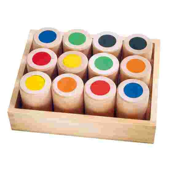 The set consists of 6 pairs with wooden cylinders of different weights. There is a coloured mark underneath to signify the matching cylinders. Of course this mark is not visible to start with: the player must check which are the matching weights by weighing them in his/her hands. That is not as easy as it seems! Delivery includes a practical wooden frame. Size of the cylinders 12×4 cm; wooden frame 16×20 cm.